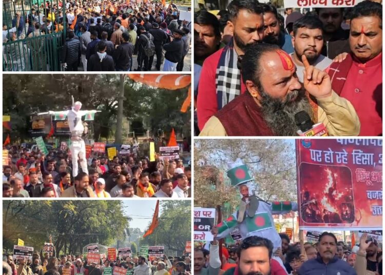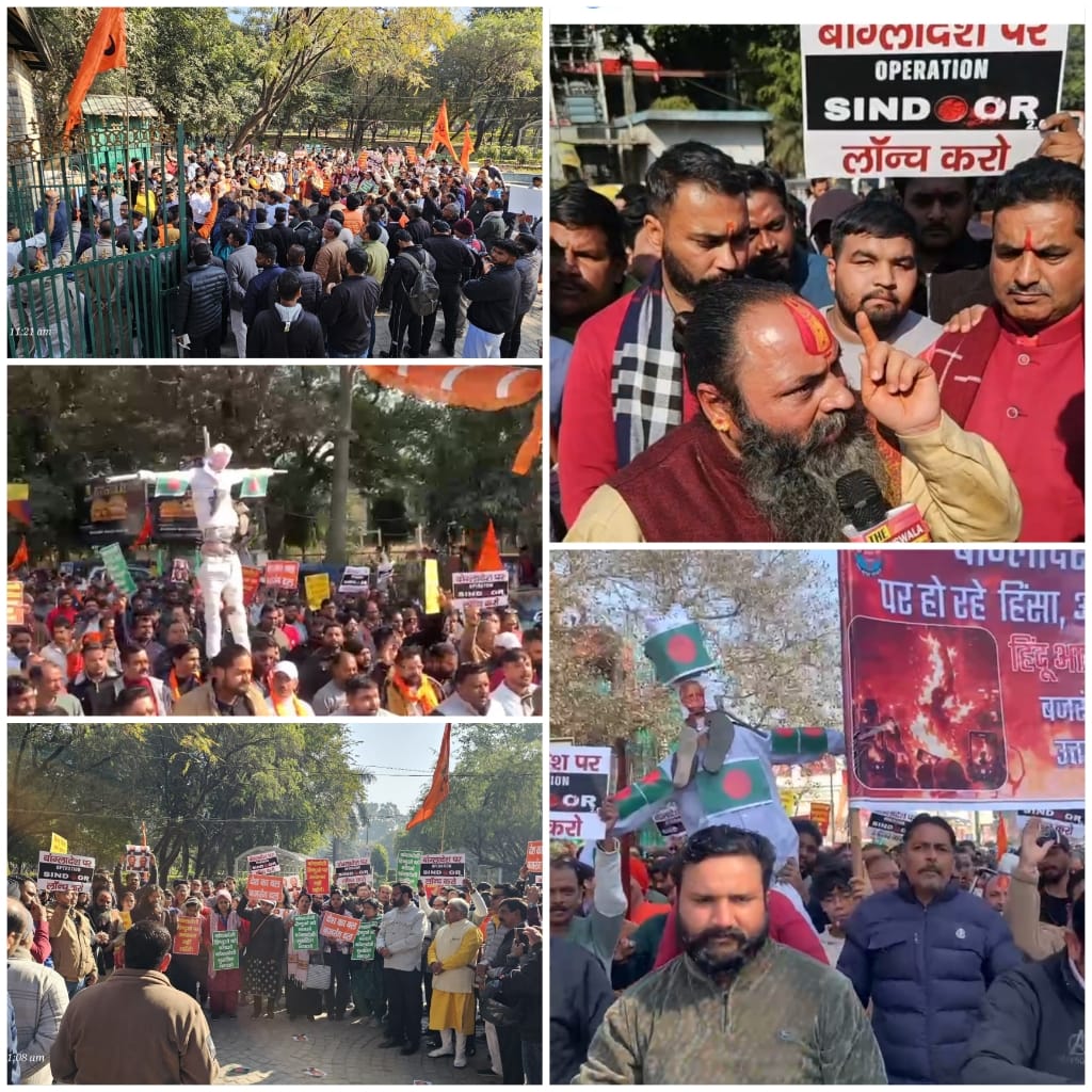 बांग्लादेश में लगातार हो रहे हिंदुओं पर लक्षित हिंसा दमन अत्याचारों के विरोध में गांधी पार्क से घंटाघर तक मार्च निकल कर हिंदू समाज ने विरोध प्रदर्शन किया । जिसमें भरी संख्या में लोगों ने आकर बांग्लादेश और इस्लामिक जिहाद पर अपना आक्रोश व्यक्त किया । प्रदर्शन की अल्पसूचना विश्व हिंदू परिषद बजरंग दल द्वारा की गई थी। परंतु साधु संतों एवं व्यापारी वर्ग और हिन्दू समाज के सभी वर्गों के लोग इस आक्रोश मार्च में सम्मिलित हुए सभी सनातनी बांग्लादेश में होने वाली हिंदुओं पर हिंसा और हत्या किए गए दीपू दास को अपने परिवार का सदस्य मानकर इस आक्रोश मार्च में उपस्थित हुए । विहिप प्रांत अध्यक्ष रविदेव आनंद ने हिन्दुओं का आह्वान करते हुए कहा कि अब हिंदुओं के पास विकल्प नहीं है हम सबको ऐसे जिहादी मानसिकता के लोगो का संपूर्ण बहिष्कार करना होगा। प्रांत अर्चक पुरोहित प्रमुख सुभाष जोशी ने कहा कि अपने बच्चों को शास्त्र पढ़ाए शास्त्रों के अध्ययन करने से समाज सबल बनेगा, बजरंग दल के प्रांत साप्ताहिक मिलन प्रमुख बजरंग दल विकास वर्मा ने अपने संबोधन में कहा की इस्लामिक जिहादियों द्वारा पूरी विश्व भर में इसी घटनाओं को अंजाम दिया जा रहा है। मरे कोई मारने वाला हर जगह ही ये जिहादी है ही है,अब हिन्दू समाज की ये लड़ाई आर पार की लड़नी होगी नहीं तो समाज का अस्तित्व संकट में है।विभाग मंत्री आलोक सिन्हा सह विभाग संगठन मंत्री अक्षत राणाकोटी ने बताया की संगठन द्वारा पूरे देश आक्रोश प्रदर्शन की योजना थी किया बजरंग दल संयोजक अमन स्वेडिया ने कहा कि देहरादून में भी ऐसे जिहादियों का आर्थिक बहिष्कार जरूरी है। अध्यक्ष अनिल मेसोन मंत्री विशाल चौधरी एवं देहरादून उत्तर जिला अध्यक्ष माधव मैथानी मंत्री श्याम शर्मा, यशवंत मौर्य सौरभ गौतम राजेश सोमवंशी, हर्ष सहगल, शशांक घिड़िय्याल, प्रेम सेठी, ललिता शर्मा, मीनू दीढा़न,गौरव तोमर, अमन राजवंशी अखिलेश अग्रवाल यशवर्धन मौर्य ,अंकुश प्रजापति, सोनू गुप्ता ,राधे गुप्ता, सुरेश गुप्ता, संदीप वाधवा, मनोज जुनेजा, हितेश, दीपांकर, साहनी, सचिन गुजराती,सक्षम,लखन खन्ना, आशीष बलूनी, अभिषेक सोनकर हरीश सेठी, शेर सिंह थपली सुरेंद्र मित्तल,योगेश कुकरेती पिछड़ा आयोग पूर्व अध्यक्ष अशोक वर्मा पुनीत मित्तल, स्वामी योगेश्वरानंद, सरदार सोनी, राशिराम वर्मा अशोक वर्मा , वशिष्ठ, अजय भारती , प्रीति शुक्ला, राजकुमार चौहान,अर्चित रावत ,करन राणा,मदन पंवार , विक्रम सिंह, विवेक, अमर चौधरी, कपिल गोगिया ,बड़ी संख्या में मातृशक्ति एवं सनातन समाज के लोग उपस्थित हुए।