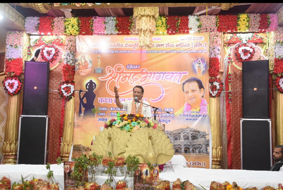 देहरादून ,अखिल भारतीय देवभूमि ब्राह्मण जन सेवा समिति रजिस्टर देहरादून द्वारा आयोजित श्रीमद् भागवत कथा ज्ञान महायज्ञ में आज कथा के दूसरे दिन परम पूज्य कथा व्यास श्री धीरज बावरा जी ने कथा की अमृत वर्षा की