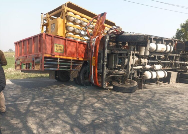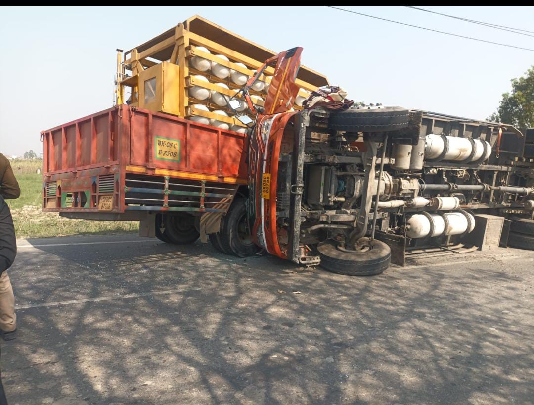 टक्कर के बाद दो गैस सिलेंडरों से लगातार रिसाव, आग-विस्फोट का मंडराया खतरा,खानपुर पुलिस ने तत्परता दिखाते हुए 200 मीटर पहले ही यातायात रोका।