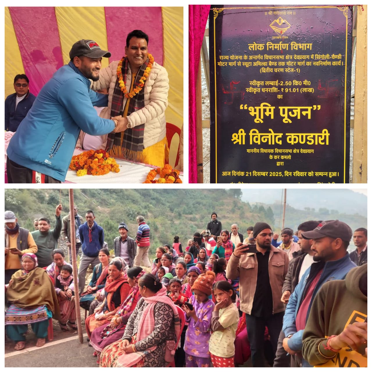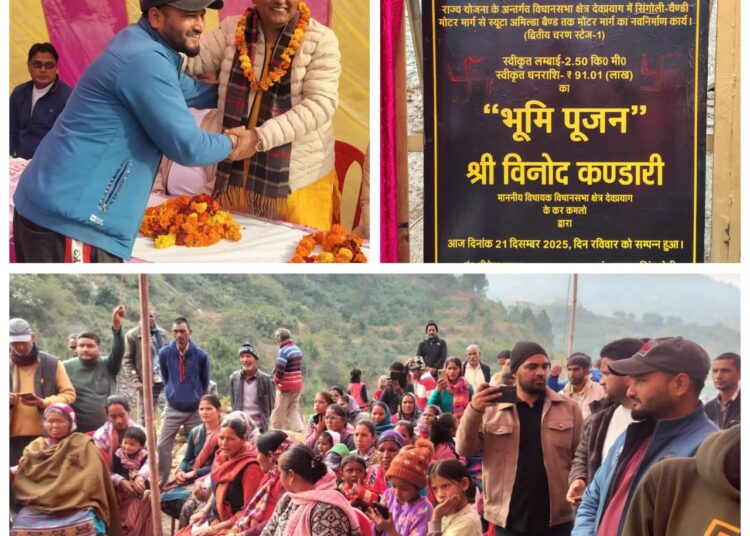 देवप्रयाग/श्रीनगर गढ़वाल। राज्य सरकार की महत्वाकांक्षी विकास योजनाओं के अंतर्गत देवप्रयाग विधानसभा क्षेत्र को एक और महत्वपूर्ण सौगात मिली है। देवप्रयाग क्षेत्र के अंतर्गत सिगोली-चैण्डी मोटर मार्ग से सयूटा-अमिल्डा तक प्रस्तावित मोटर मार्ग के नवनिर्माण कार्य का विधिवत शिलान्यास क्षेत्रीय विधायक विनोद कंडारी द्वारा किया गया। योर मोटर मार्ग 91.01 लाख रुपए की लागत से निर्मित किया जाएगा,जिसकी कुल लंबाई 2.50 किलोमीटर होगी। मार्ग के निर्माण से क्षेत्र के ग्रामीणों को आवागमन की बेहतर सुविधा मिलेगी,साथ ही शिक्षा,स्वास्थ्य,कृषि और आपातकालीन सेवाओं तक पहुंच सुगम होगी। शिलान्यास कार्यक्रम को संबोधित करते हुए विधायक विनोद कंडारी ने कहा कि देवप्रयाग विधानसभा क्षेत्र का समग्र विकास मेरी सर्वोच्च प्राथमिकता है। सड़क,बिजली,पानी और स्वास्थ्य जैसी बुनियादी सुविधाओं को गांव-गांव तक पहुंचाना ही सशक्त उत्तराखंड की नींव है। यह मार्ग वर्षों से स्थानीय जनता की मांग थी,जिसे अब पूरा किया जा रहा है। उन्होंने कहा कि मोटर मार्ग के निर्माण से सयूटा-अमिल्डा एवं आसपास के गांवों को सीधा लाभ मिलेगा और क्षेत्र के सामाजिक-आर्थिक विकास को नई गति प्राप्त होगी। कार्यक्रम में ब्लॉक प्रमुख विनोद बिष्ट,अधिशासी अभियंता धीरेंद्र कुमार,जिला मंत्री प्रमोद चंद्र,नरेंद्र रावत,गोविंद चौहान मंत्री,संयोजक बुद्धि नेगी,क्षेत्र पंचायत सदस्य कर्म सिंह,प्रधान सुषमा देवी,कमलजीत क्षेत्र पंचायत सदस्य तथा अभिषेक सहित भारतीय जनता पार्टी के अनेक वरिष्ठ पदाधिकारी,जनप्रतिनिधि एवं कार्यकर्ता उपस्थित रहे। स्थानीय जन प्रतिनिधियों और ग्रामीणों ने विधायक विनोद कंडारी का आभार व्यक्त करते हुए कहा कि योर सड़क क्षेत्र के लिए जीवन रेखा सिद्ध होगी और लंबे समय से चली आ रही आवागमन की समस्याओं का समाधान करेगी। कार्यक्रम के दौरान क्षेत्र में विकास कार्यों को समयबद्ध और गुणवत्ता के साथ पूर्ण करने का आश्वासन भी दिया गया। शिलान्यास के अवसर पर उपस्थित जनसमूह में उत्साह और प्रसन्नता का माहौल देखने को मिला।