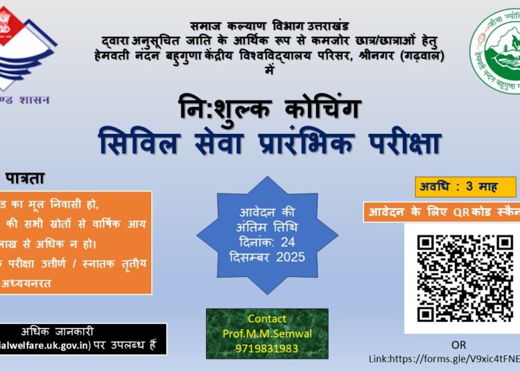 श्रीनगर गढ़वाल। सिविल सेवा में अपना भविष्य संवारने का सपना देख रहे आर्थिक रूप से कमजोर वर्गों के प्रतिभाशाली युवाओं के लिए एक बड़ा और सुनहरा अवसर सामने आया है। समाज कल्याण विभाग उत्तराखण्ड द्वारा अनुसूचित जाति के आर्थिक रूप से कमजोर छात्र-छात्राओं के लिए निःशुल्क सिविल सेवा प्रारंभिक परीक्षा कोचिंग की शुरुआत की गई है। यह कोचिंग हेमवती नंदन बहुगुणा केंद्रीय विश्वविद्यालय परिसर श्रीनगर (गढ़वाल) में संचालित होगी। इस विशेष पहल का उद्देश्य है-योग्य लेकिन आर्थिक तंगी के कारण पीछे रह जाने वाले युवाओं को उच्च स्तर की तैयारी और बेहतर मार्गदर्शन उपलब्ध कराना। अभ्यर्थी उत्तराखण्ड का मूल निवासी हो। परिवार की वार्षिक आय 2 लाख रुपए से अधिक न हो। स्नातक उत्तीर्ण या स्नातक तृतीय वर्ष में अध्ययनरत छात्र-छात्राएं आवेदन कर सकते हैं। कोचिंग कार्यक्रम की अवधि 3 माह निर्धारित की गई है। इच्छुक अभ्यर्थी पोस्टर में दिए गए QR कोड को स्कैन कर ऑनलाइन आवेदन कर सकते हैं। इसके अतिरिक्त फॉर्म भरने के लिए लिंक भी उपलब्ध है। आवेदन की अंतिम तिथि-24 दिसंबर 2025 संपर्क सूत्र-कोचिंग से संबंधित विस्तृत जानकारी हेतु संपर्क करें-एम.एम.सेमवाल 9719831983 साथ ही अधिक विवरण समाज कल्याण विभाग की आधिकारिक वेबसाइट पर उपलब्ध हैं। उद्देश्य और अपेक्षित लाभ-यह कोचिंग कार्यक्रम प्रदेश के ग्रामीण और कमजोर आर्थिक पृष्ठभूमि से आने वाले युवाओं के लिए किसी वरदान से कम नहीं है। विशेषज्ञ शिक्षकों,अनुभवी मेंटर्स तथा समर्पित शैक्षणिक वातावरण के माध्यम से अभ्यर्थियों को उच्च गुणवत्ता की तैयारी उपलब्ध कराई जाएगी। इससे युवाओं में प्रशासनिक सेवाओं में पहुंचने का विश्वास बढ़ेगा और समाज के हर वर्ग का प्रतिनिधित्व सुदृढ़ होगा। कार्यक्रम को लेकर छात्रों में उत्साह देखा जा रहा है और विभाग की इस पहल की सराहना की जा रही है। विशेषज्ञों का मानना है कि ऐसी योजनाएं प्रतिभाओं को निखारने और उन्हें राष्ट्र निर्माण की दिशा में अग्रसर करने में महत्वपूर्ण भूमिका निभाती हैं।