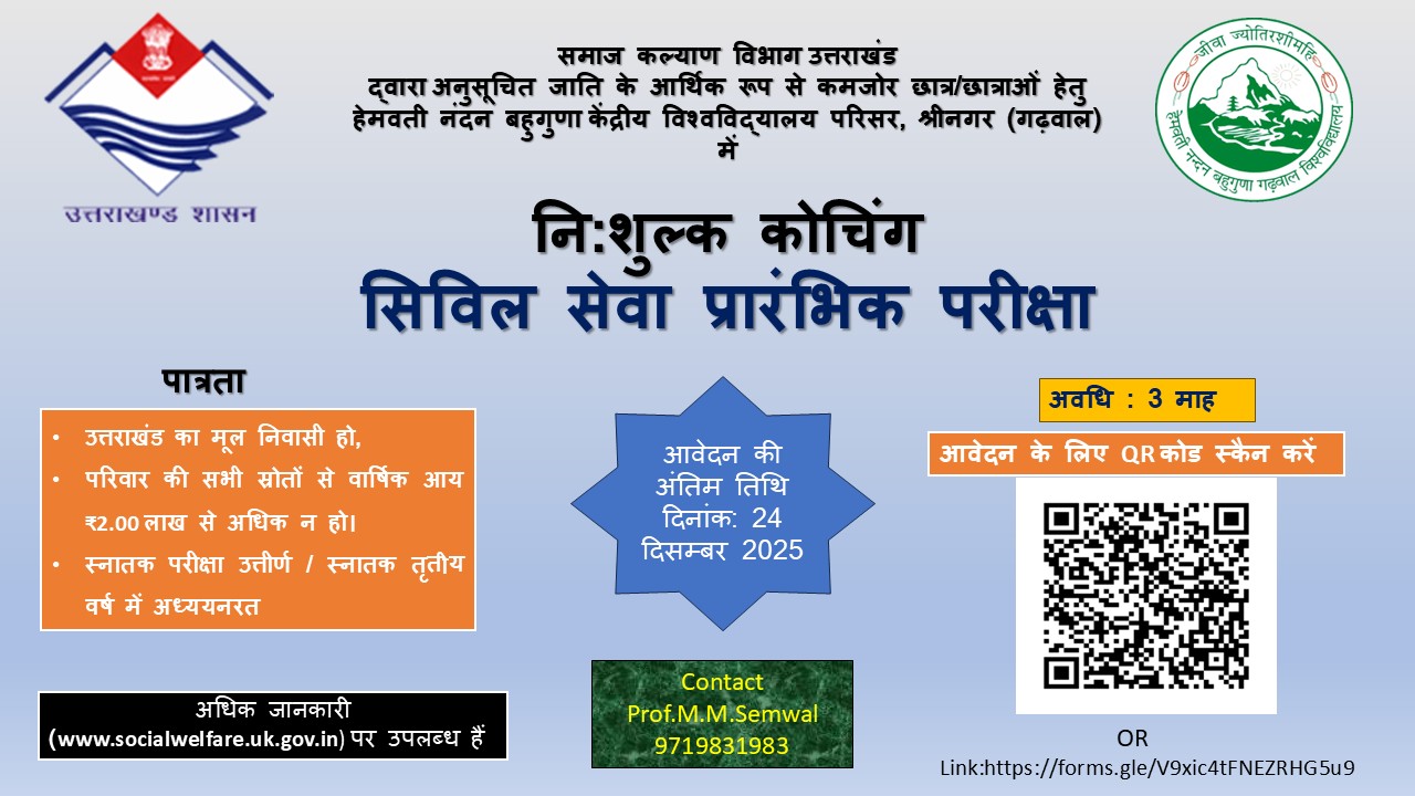 श्रीनगर गढ़वाल। सिविल सेवा में अपना भविष्य संवारने का सपना देख रहे आर्थिक रूप से कमजोर वर्गों के प्रतिभाशाली युवाओं के लिए एक बड़ा और सुनहरा अवसर सामने आया है। समाज कल्याण विभाग उत्तराखण्ड द्वारा अनुसूचित जाति के आर्थिक रूप से कमजोर छात्र-छात्राओं के लिए निःशुल्क सिविल सेवा प्रारंभिक परीक्षा कोचिंग की शुरुआत की गई है। यह कोचिंग हेमवती नंदन बहुगुणा केंद्रीय विश्वविद्यालय परिसर श्रीनगर (गढ़वाल) में संचालित होगी। इस विशेष पहल का उद्देश्य है-योग्य लेकिन आर्थिक तंगी के कारण पीछे रह जाने वाले युवाओं को उच्च स्तर की तैयारी और बेहतर मार्गदर्शन उपलब्ध कराना। अभ्यर्थी उत्तराखण्ड का मूल निवासी हो। परिवार की वार्षिक आय 2 लाख रुपए से अधिक न हो। स्नातक उत्तीर्ण या स्नातक तृतीय वर्ष में अध्ययनरत छात्र-छात्राएं आवेदन कर सकते हैं। कोचिंग कार्यक्रम की अवधि 3 माह निर्धारित की गई है। इच्छुक अभ्यर्थी पोस्टर में दिए गए QR कोड को स्कैन कर ऑनलाइन आवेदन कर सकते हैं। इसके अतिरिक्त फॉर्म भरने के लिए लिंक भी उपलब्ध है। आवेदन की अंतिम तिथि-24 दिसंबर 2025 संपर्क सूत्र-कोचिंग से संबंधित विस्तृत जानकारी हेतु संपर्क करें-एम.एम.सेमवाल 9719831983 साथ ही अधिक विवरण समाज कल्याण विभाग की आधिकारिक वेबसाइट पर उपलब्ध हैं। उद्देश्य और अपेक्षित लाभ-यह कोचिंग कार्यक्रम प्रदेश के ग्रामीण और कमजोर आर्थिक पृष्ठभूमि से आने वाले युवाओं के लिए किसी वरदान से कम नहीं है। विशेषज्ञ शिक्षकों,अनुभवी मेंटर्स तथा समर्पित शैक्षणिक वातावरण के माध्यम से अभ्यर्थियों को उच्च गुणवत्ता की तैयारी उपलब्ध कराई जाएगी। इससे युवाओं में प्रशासनिक सेवाओं में पहुंचने का विश्वास बढ़ेगा और समाज के हर वर्ग का प्रतिनिधित्व सुदृढ़ होगा। कार्यक्रम को लेकर छात्रों में उत्साह देखा जा रहा है और विभाग की इस पहल की सराहना की जा रही है। विशेषज्ञों का मानना है कि ऐसी योजनाएं प्रतिभाओं को निखारने और उन्हें राष्ट्र निर्माण की दिशा में अग्रसर करने में महत्वपूर्ण भूमिका निभाती हैं।