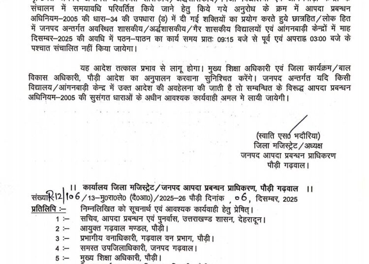 पौड़ी/श्रीनगर गढ़वाल। जिलाधिकारी स्वाति एस.भदौरिया द्वारा गढ़वाल वन प्रभाग,पौड़ी से प्राप्त जानकारी एवं वन्यजीव संवेदनशीलता को देखते हुए जनपद अंतर्गत विद्यालयों एवं आंगनबाड़ी केन्द्रों के समय में अस्थायी परिवर्तन किया गया है। गढ़वाल वन प्रभाग द्वारा अवगत कराया गया कि मानव-वन्यजीव संघर्ष की बढ़ती घटनाओं,दिन के समय वन्यजीवों की सक्रियता एवं सर्दी के मौसम में शाम जल्दी होने के कारण विद्यालयों एवं आंगनबाड़ी केन्द्रों के मार्ग वन क्षेत्रान्तर्गत संवेदनशील हो जाते हैं,जिससे मानव एवं वन्यजीव संघर्ष की आशंका बढ़ जाती है। इन परिस्थितियों को दृष्टिगत रखते हुए जिलाधिकारी ने आपदा प्रबंधन अधिनियम-2005 की धारा 34(ड) के तहत प्राप्त शक्तियों का प्रयोग करते हुए आदेश जारी करते हुए कहा है कि जनपद पौड़ी गढ़वाल के सभी शासकीय/अर्द्धशासकीय/निजी विद्यालय एवं आंगनबाड़ी केन्द्र दिसम्बर माह में प्रात-9.15 बजे से पूर्व तथा अपराह्न 3 बजे के पश्चात संचालित नहीं होंगे। उन्होंने मुख्य शिक्षा अधिकारी एवं जिला कार्यक्रम/बाल विकास अधिकारी को निर्देशित किया है कि आदेश का कड़ाई से सख्ती के साथ शत-प्रतिशत अनुपालन सुनिश्चित किया जाए। उन्होंने स्पष्ट किया है कि किसी भी विद्यालय या आंगनबाड़ी केन्द्र में उल्लंघन पाए जाने पर संबंधित के विरुद्ध आपदा प्रबंधन अधिनियम-2005 के प्रावधानों के अंतर्गत आवश्यक कार्रवाई अमल में लाई जाएगी।