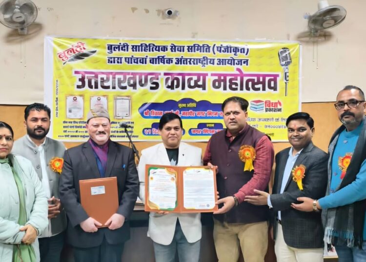 उत्तराखंड काव्य महोत्सव में कवि अशोक अंजाना सम्मानितरुद्रपुर।बुलंदी साहित्यिक सेवा समिति द्वारा आयोजित उत्तराखण्ड काव्य महोत्सव पांचवें वार्षिक अंतरराष्ट्रीय आयोजन में सम्मानित हुए शहर के अशोक अंजानाआयोजन का शुभारंभ रुद्रपुर नगर निगम के महापौर श्री विकास शर्मा जी द्वारा दीप प्रज्वलन कर किया गया। इस अवसर पर रुद्रपुर निवासी वरिष्ठ कवि अशोक अंजाना को उनके साहित्यिक योगदान के लिए “साहित्य शिरोमणि सम्मान” से सम्मानित किया गया। यह सम्मान महापौर श्री विकास शर्मा जी के करकमलों द्वारा प्रदान किया गया।कार्यक्रम में इंडोनेशिया से सुषमा श्रीवास्तव नेपाल से रमेश पंत , हेमबाबू लेखक , खेमानंद बड़ू सहित भारत के विभिन्न प्रांतों के साहित्यकारों की गरिमामयी उपस्थिति रही, जिससे आयोजन को अंतरराष्ट्रीय स्वरूप प्राप्त हुआ।उक्त आयोजन में बुलंदी साहित्यिक सेवा समिति के संस्थापक विवेक बादल बाज़पुरी सहित भारतीय जनता पार्टी युवा मोर्चा के जिला अध्यक्ष श्री बिट्टू चौहान जी सहित नीलेश निराला , नवी दर बदर , सत्यार्थ , जगमोहन जगमोरा उपस्थित रहे lकार्यक्रम में काव्य पाठ, साहित्यिक संवाद एवं सम्मान समारोह के माध्यम से साहित्य और संस्कृति के संवर्धन का संदेश दिया गया।