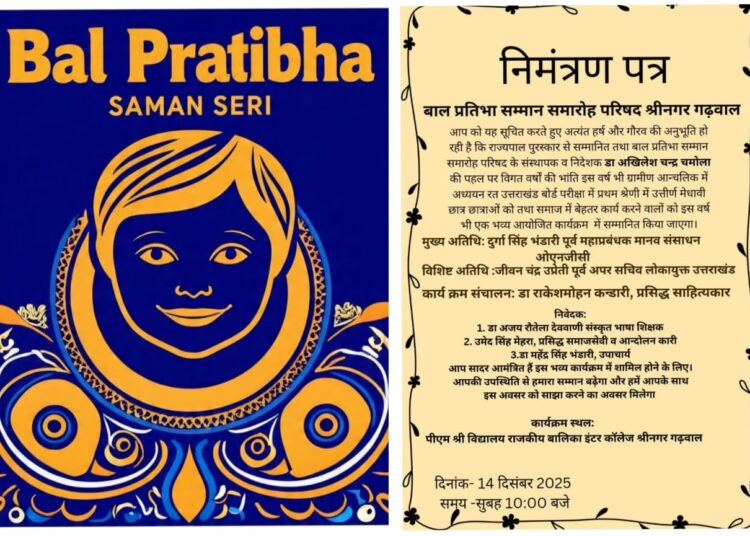 श्रीनगर गढ़वाल। ग्राम्य अंचल की प्रतिभाओं को मंच देने और उन्हें समाज के सामने गौरव के साथ प्रस्तुत करने के उद्देश्य से बाल प्रतिभा सम्मान समारोह परिषद श्रीनगर द्वारा आगामी 14 दिसंबर 2025 को एक भव्य एवं गरिमामयी सम्मान समारोह आयोजित किया जा रहा है। राज्यपाल पुरस्कार से सम्मानित तथा बाल प्रतिभा सम्मान समारोह परिषद के संस्थापक व निदेशक डॉ.अखिलेश चन्द्र चमोला की दूरदर्शी सोच एवं सतत प्रयासों से प्रतिवर्ष की भांति इस वर्ष भी यह आयोजन उसी उत्साह और ऊर्जा के साथ संपन्न होने जा रहा है। डॉ.चमोला ने वर्षों पूर्व ग्रामीण क्षेत्रों की मेधावी प्रतिभाओं के लिए एक ऐसा मंच तैयार किया,जहां शैक्षणिक उत्कृष्टता,रचनात्मकता और सामाजिक कार्यों में अग्रसर विद्यार्थियों को उनके कार्यों के अनुरूप सम्मान मिले। इसी परंपरा के चलते इस वर्ष भी उत्तराखण्ड बोर्ड परीक्षा में प्रथम श्रेणी में उत्तीर्ण हुए,तथा अपने-अपने क्षेत्रों में विशेष प्रदर्शन करने वाले छात्र-छात्राओं को कार्यक्रम में सम्मानित किया जाएगा। कार्यक्रम की गरिमा बढ़ाएंगे समारोह में मुख्य अतिथि के रूप में दुर्गा सिंह भंडारी पूर्व महाप्रबंधक मानव संसाधन (ओएनजीसी) उपस्थित रहेंगे जिनकी उपस्थिति से पूरे आयोजन की गरिमा कई गुना बढ़ने जा रही है। विशिष्ट अतिथि के तौर पर जीवन चंद्र उप्रेती पूर्व अपर सचिव लोकायुक्त उत्तराखंड प्रतिभागियों को प्रेरक उद्बोधन देंगे। कार्यक्रम का संचालन वरिष्ठ साहित्यकार डॉ.राकेश मोहन कंडारी करेंगे जिनकी साहित्यिक व सामाजिक समझ समारोह को और प्रभावशाली बनाएगी। इस आयोजन को सफल बनाने में परिषद के निःस्वार्थ सेवाभावी सदस्य-डॉ.अजय रौतेला देववाणी संस्कृत भाषा शिक्षक,उमेद सिंह मेहरा प्रसिद्ध समाजसेवी एवं आंदोलनकारी,डॉ.महेंद्र सिंह भंडारी उपाचार्य अपनी महत्वपूर्ण भूमिका निभा रहे हैं। डॉ.अखिलेश चन्द्र चमोला का मानना है कि ग्राम्य क्षेत्र की हर प्रतिभा देश का भविष्य है। उन्हें प्रोत्साहन,सम्मान और अवसर प्रदान करना ही समाज का सर्वोच्च दायित्व है। इसी विचार को मूर्त रूप देने के लिए परिषद लगातार कार्य कर रही है और ग्रामीण क्षेत्रों के छात्र-छात्राओं में शिक्षा,संस्कार और प्रतिस्पर्धा की भावना जगाने का प्रयास कर रही है। कार्यक्रम स्थल एवं समय-पीएसएम श्री विद्यालय राजकीय बालिका इंटर कॉलेज, श्रीनगर गढ़वाल,समय-प्रात: 10 बजे। इस वार्षिक आयोजन से न केवल छात्र-छात्राओं का मनोबल बढ़ता है,बल्कि समाज में शिक्षा के प्रति सकारात्मक संदेश भी जाता है। परंपरा,संस्कार और उत्कृष्टता के इस अनूठे मेल ने बाल प्रतिभा सम्मान समारोह परिषद को पूरे गढ़वाल में एक प्रेरणा का केंद्र बना दिया है।