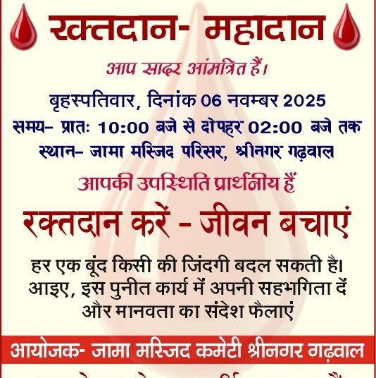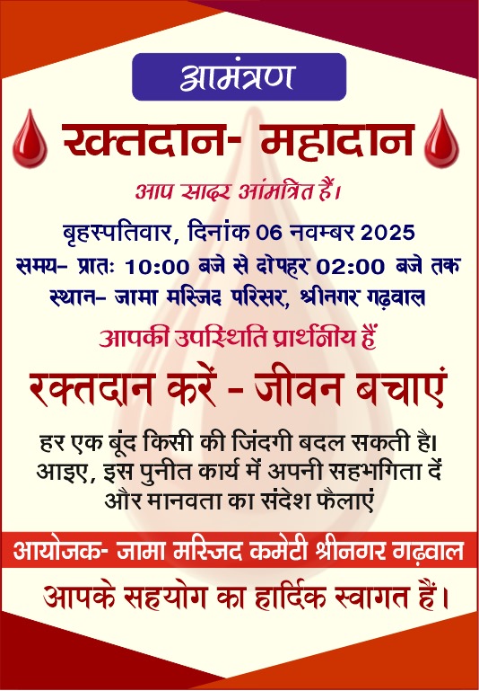 श्रीनगर गढ़वाल। मानवता और सामाजिक एकता का संदेश देने वाला एक ऐतिहासिक आयोजन 6 नवम्बर 2025 बृहस्पतिवार को श्रीनगर गढ़वाल में होने जा रहा है। जामा मस्जिद परिसर श्रीनगर में प्रात-10 बजे से दोपहर 2 बजे तक विशाल रक्तदान शिविर का आयोजन किया जाएगा। इस शिविर का उद्देश्य है रक्तदान करें,जीवन बचाएं-क्योंकि हर दान की गई बूंद किसी जरूरतमंद की जिंदगी बचा सकती है। यह प्रेरणादायी आयोजन जामा मस्जिद कमेटी श्रीनगर के सहयोग से किया जा रहा है,जिसमें बेस अस्पताल श्रीकोट की ब्लड बैंक टीम सक्रिय सहयोग प्रदान करेगी। इस पुनीत कार्य के माध्यम से श्रीनगर नगर में मानवीय संवेदना,आपसी सद्भाव और सामाजिक जिम्मेदारी का एक सुंदर संदेश प्रसारित किया जाएगा। मानवता की मिसाल बनेगा श्रीनगर-कार्यक्रम आयोजकों का कहना है कि यह रक्तदान शिविर केवल एक स्वास्थ्य पहल नहीं,बल्कि मानवता की सेवा का उत्सव है। इस अवसर पर नगर के विभिन्न सामाजिक संगठनों,व्यापारिक प्रतिनिधियों,शिक्षकों,युवाओं और छात्र-छात्राओं से रक्तदान के लिए विशेष अपील की गई है। रक्तदान एक ऐसा दान है जो जीवन देता है,किसी की मुस्कान लौटाता है और इंसानियत को नई परिभाषा देता है। आयोजकों ने कहा बेस अस्पताल की विशेषज्ञ टीम करेगी रक्त संग्रहण-शिविर में बेस अस्पताल श्रीकोट की ब्लड डिपार्टमेंट टीम द्वारा सभी रक्तदाताओं का स्वास्थ्य परीक्षण,रक्त संग्रहण किया जाएगा। विशेषज्ञ चिकित्सक पूरी निगरानी में यह प्रक्रिया संचालित करेंगे ताकि रक्तदाताओं को सुरक्षित और स्वच्छ वातावरण में दान करने का अनुभव प्राप्त हो। जामा मस्जिद कमेटी की प्रेरक पहल-जामा मस्जिद कमेटी श्रीनगर के पदाधिकारियों ने बताया कि मस्जिद परिसर में यह शिविर आयोजित कर साम्प्रदायिक सौहार्द,सामाजिक एकता और मानवीय सेवा का संदेश दिया जा रहा है। समिति ने नगरवासियों से अधिकाधिक संख्या में पहुंचकर इस रक्त महादान में सहभागी बनने की अपील की है। रक्तदान सच्ची इंसानियत की पहचान-आयोजकों का कहना है कि हर व्यक्ति समाज के प्रति अपने उत्तरदायित्व को निभा सकता है और रक्तदान इसका सर्वोत्तम उदाहरण है। रक्तदान न केवल किसी जरूरतमंद की जान बचाता है बल्कि दाता के भीतर सेवा,करुणा और आत्मसंतोष की भावना भी उत्पन्न करता है। जीवन का सबसे बड़ा उपहार रक्तदान 6 नवम्बर को आयोजित इस शिविर में नगर के युवाओं,महिलाओं,शिक्षकों और समाजसेवियों की भागीदारी अपेक्षित है। प्रशासनिक और स्वास्थ्य विभाग के अधिकारी भी इस महादान में अपनी उपस्थिति दर्ज कराएंगे। हर बूंद मायने रखती है-आपका एक कदम किसी परिवार की दुनिया रोशन कर सकता है।